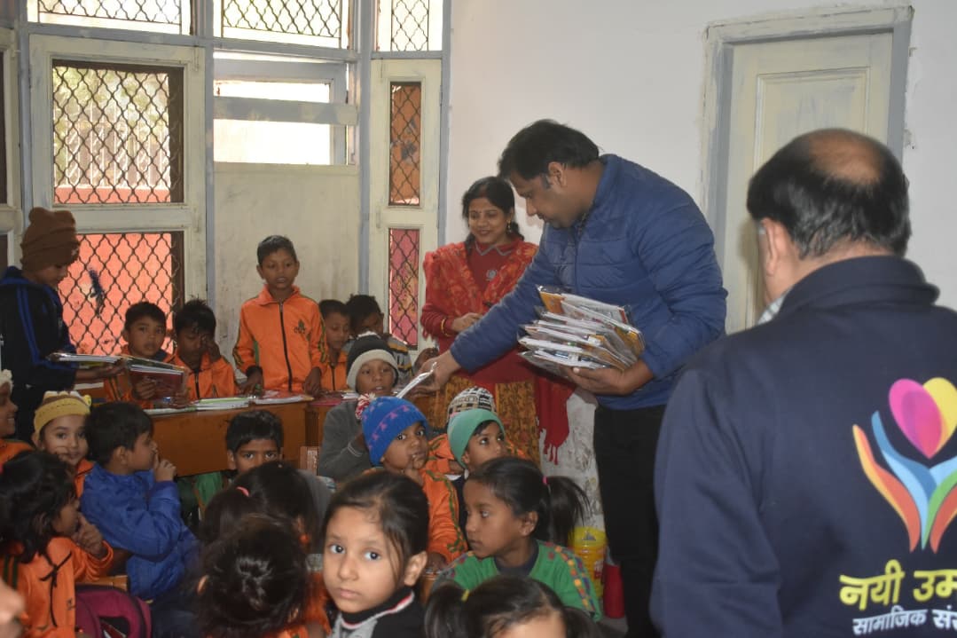 बच्चों को खुशियां बांटने और उनकी जरूरतें पूरी करने के लिए नयी उमंग सामाजिक संस्था द्वारा पाठ्य समागिरी वितरण कार्यक्रम किया गया